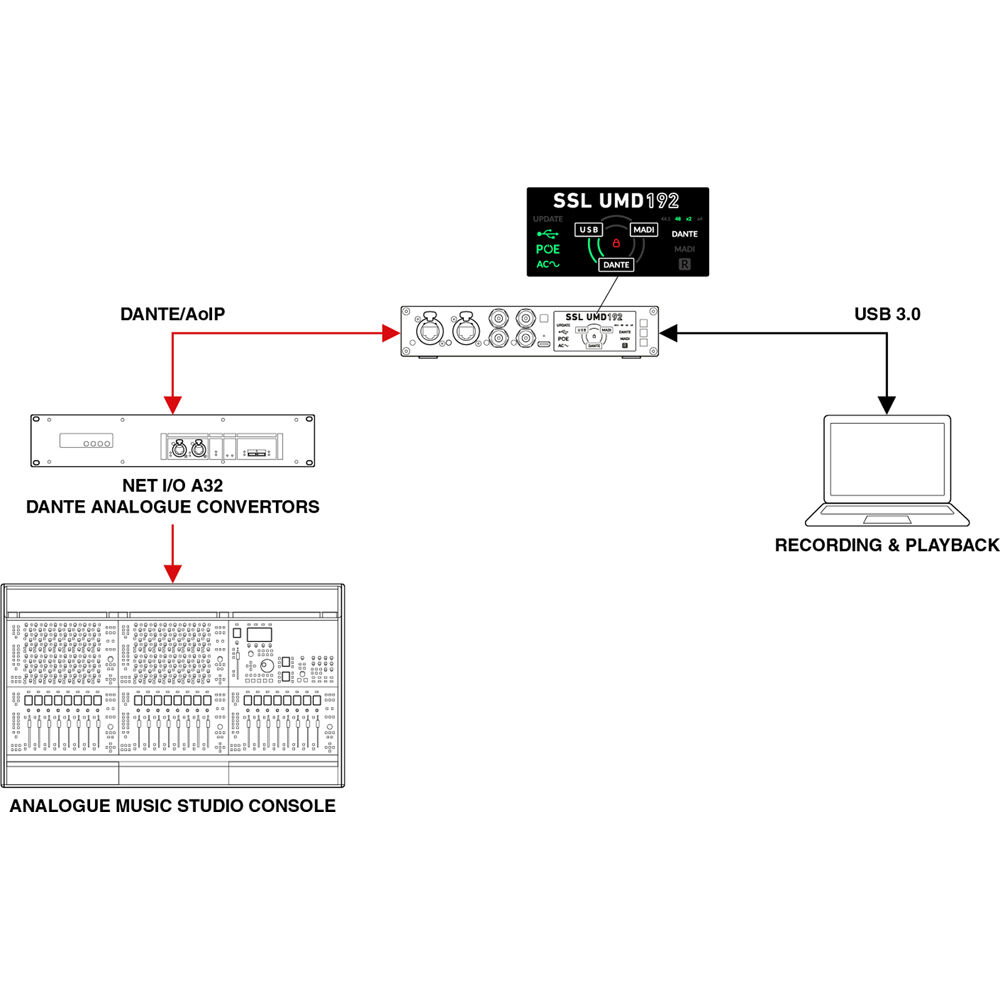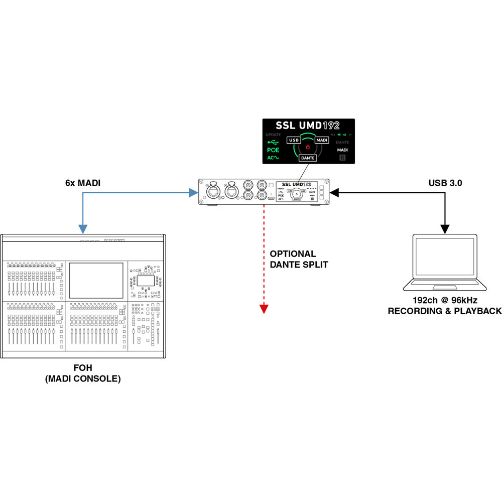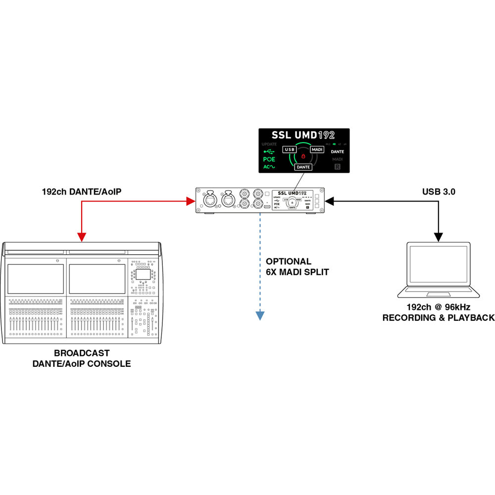 Solid State Logic is proud to introduce the UMD192, a powerful and portable USB audio interface designed to meet the demands of high-spec studios, professional live sound, and broadcast environments. With seamless integration across MADI, Dante, and USB, the UMD192 offers flexible routing, high channel counts, and uncompromising performance for recording, playback, and format bridging. Providing 192 channels at both 96 and 48 kHz, or 128 channels at 192 kHz in a compact and portable ½RU form factor.